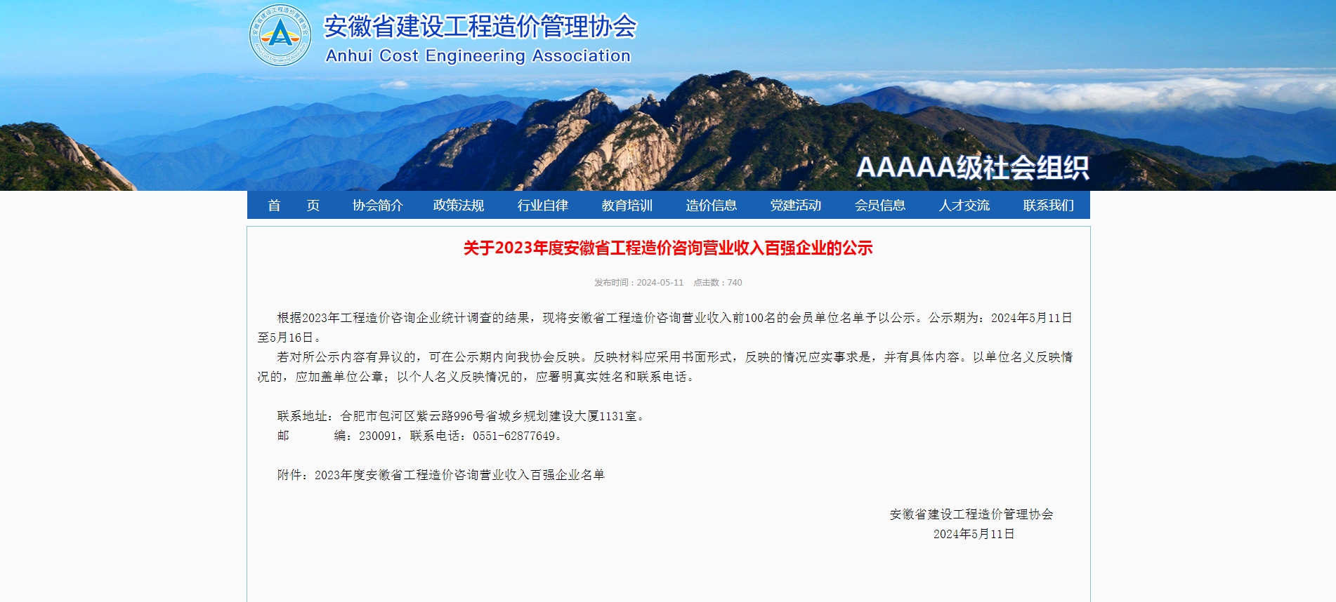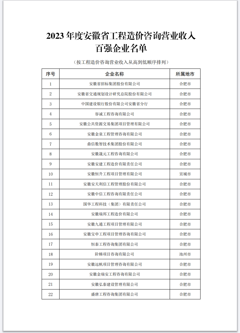 日前,安徽省建设工程造价管理协会对2023年度安徽省工程造价咨询营业收入百强企业进行了公示,米兰官方版网站登录入口-米兰online(中国) 位居全省第六名。