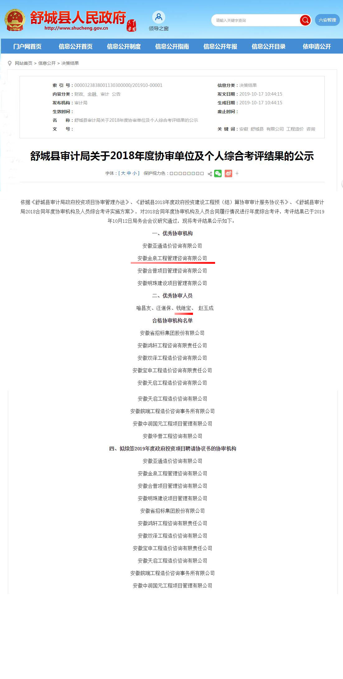 热烈祝贺公司荣获舒城县2018年度优秀协审机构