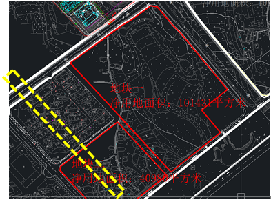 4、根据现场调研,地块一内部有两条高压走廊,且有铁塔,如下图两条黄线位置,对地块一的布局有很大影响,该两条高压铁塔是否能够搬迁?方案是否需要考虑该高压走廊的存在?