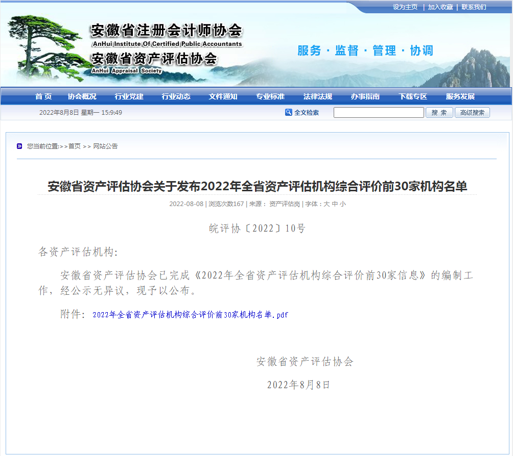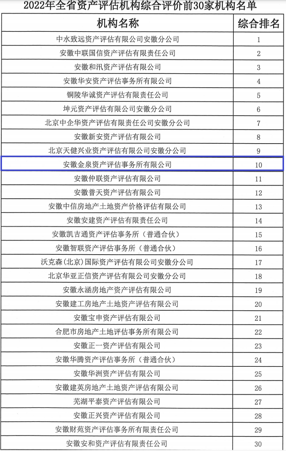 8月,2022年全省资产评估机构综合评价排名出炉,安徽金泉资产评估事务所有限公司排名前十!