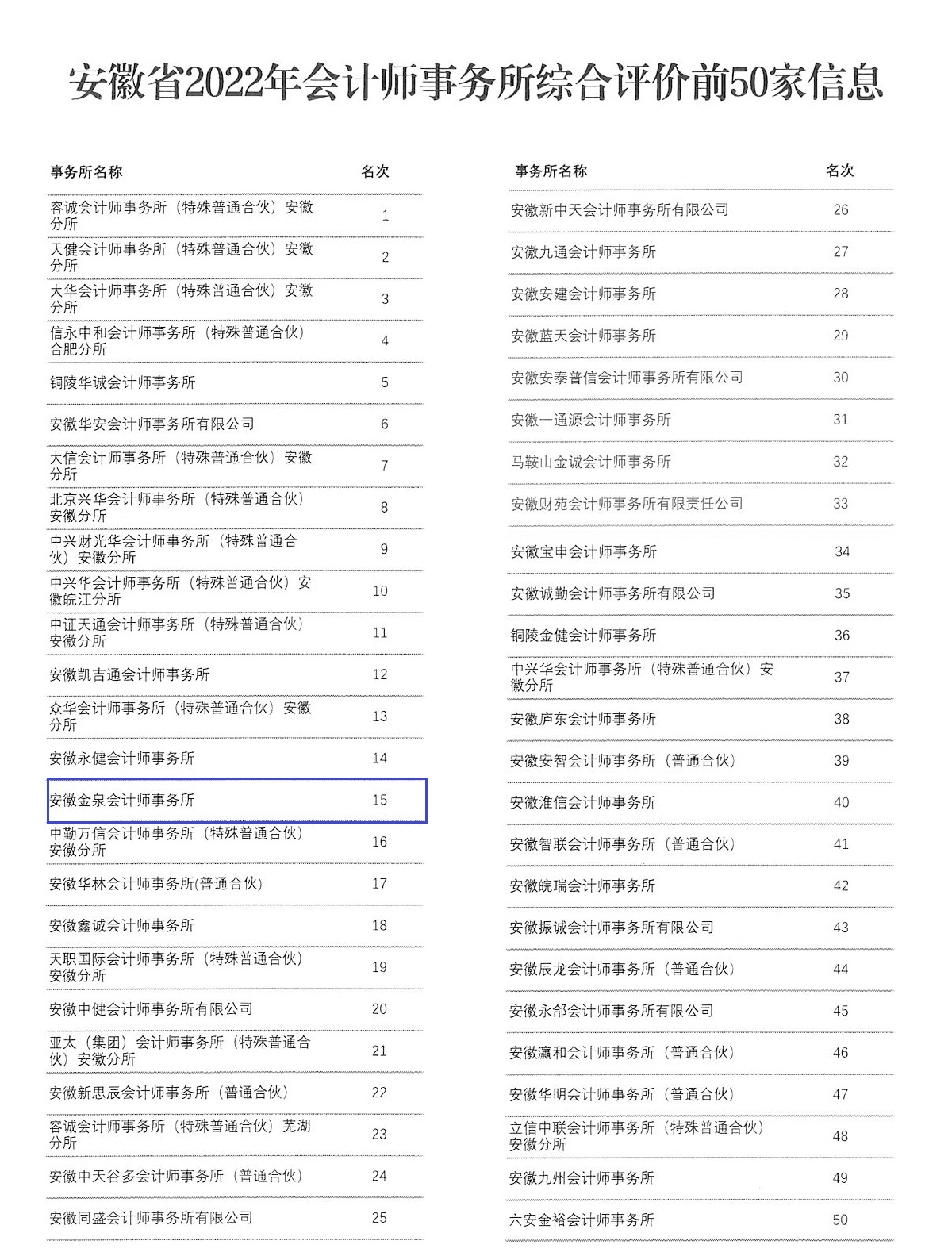 9月,安徽省注册会计师协会发布2022年会计师事务所综合评价前50家信息,安徽金泉会计师事务所全省排名稳步上升,位列前15名。