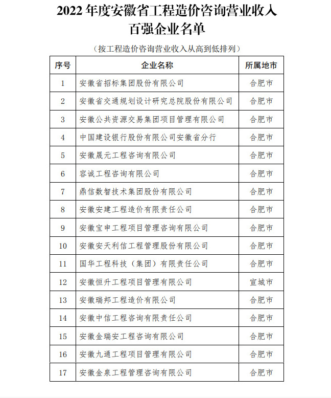近期,安徽省建设工程造价管理协会公布了2022年度安徽省工程造价咨询营业收入前100名的会员单位名单,米兰官方版网站登录入口-米兰online(中国) 位列17名,连续多年上榜。