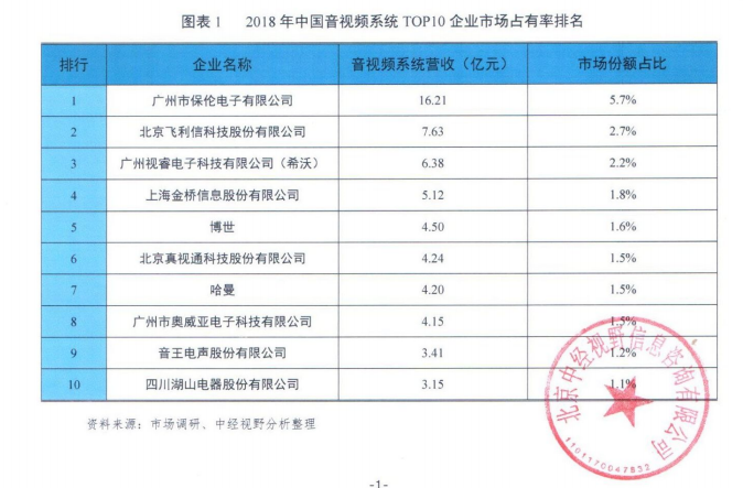 下图为第三方市场调研服务机构:北京中经视野信息咨询有限公司《2018年中国音视频系统TOP10企业市场占有率排名》