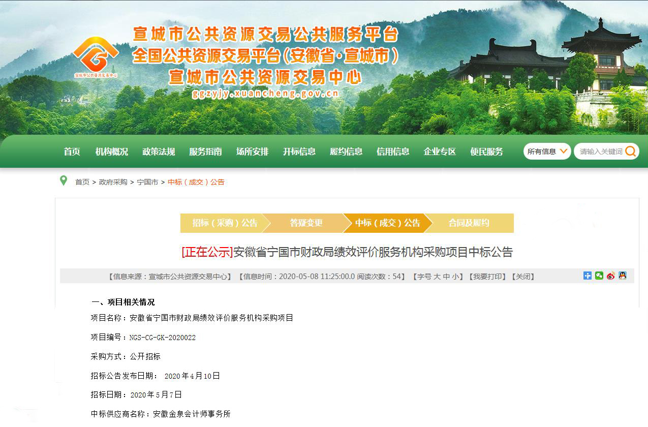 5月8日,宣城市公共资源交易中心发布公告,安徽金泉会计师事务所成功中标安徽省宁国市财政局绩效评价服务机构采购项目。