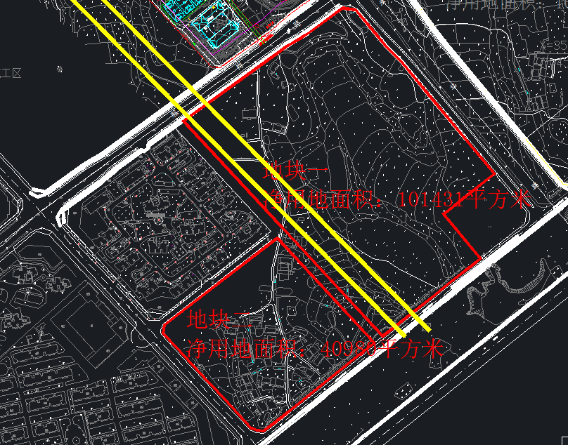 4、根据现场调研,地块一内部有两条高压走廊,且有铁塔,如下图两条黄线位置,对地块一的布局有很大影响,该两条高压铁塔是否能够搬迁?方案是否需要考虑该高压走廊的存在?