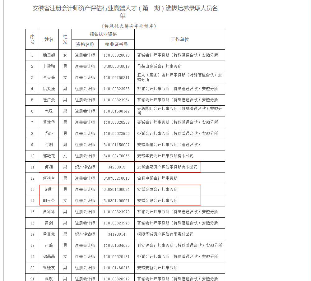 为贯彻落实省财政厅、省委组织部、省人社厅、省国资委《安徽省高端会计人才培养工作实施意见》,安徽省注册会计师协会和安徽省资产评估协会开展了安徽省注册会计师资产评估行业高端人才(第一期)选拔培养工作,经申报、综合素质考量、笔试、面试和公示等环节,正式录取了50名行业高端人才学员。金泉公司注册会计师胡斯、胡玉荣,资产评估师何昶入选。